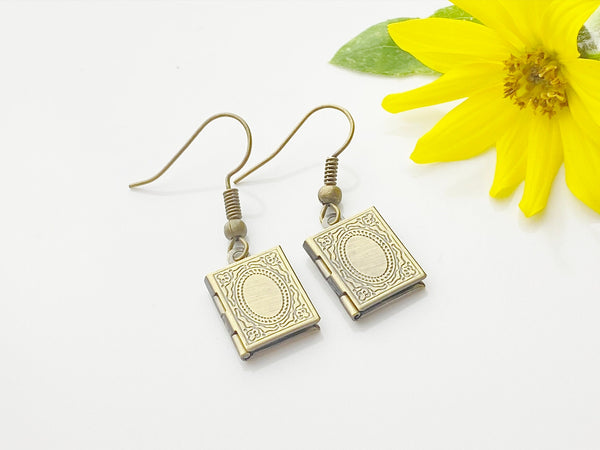 These are silver-toned SMALL book locket on brass or stainless steel ear hooks.