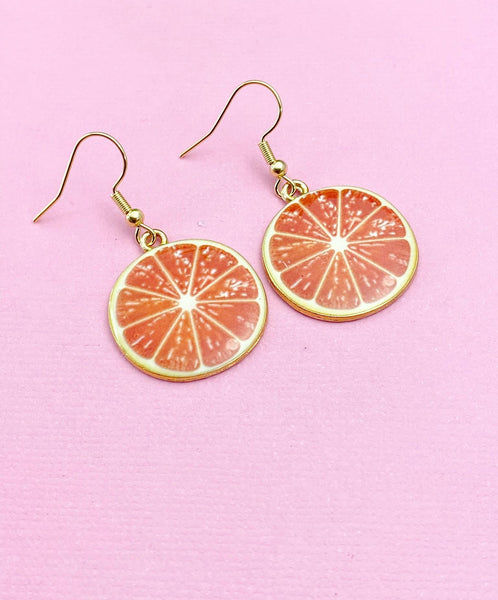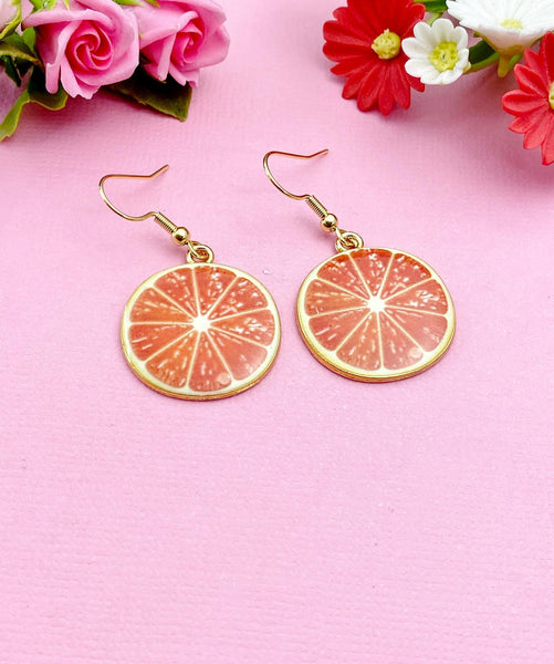This is a gold - tone orange charm hangs on the stainless steel ear hook.
