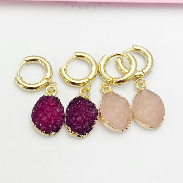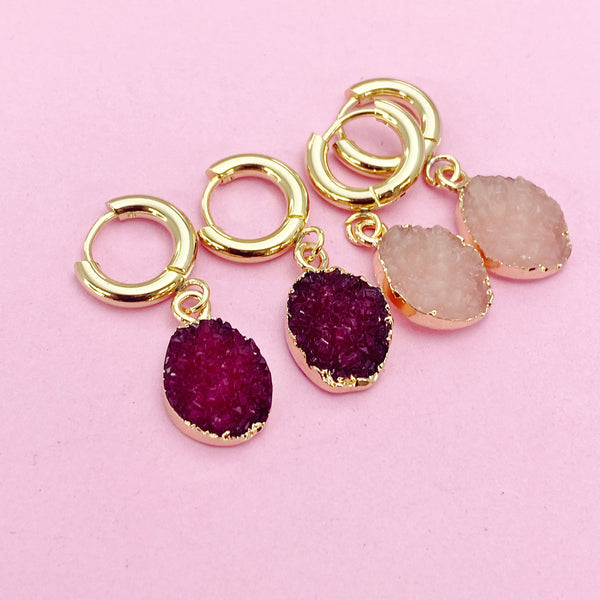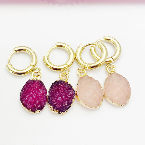 These are gold-toned Electroplate Druzy Resin charms with stainless steel ear hooks.