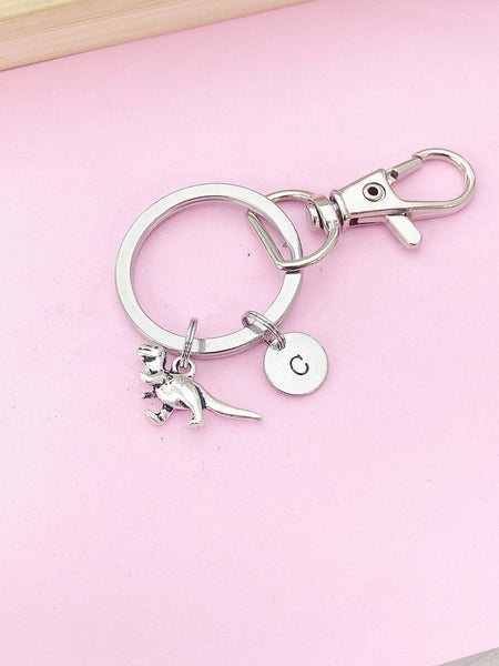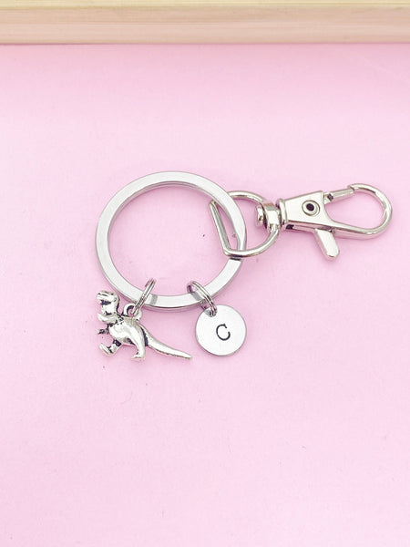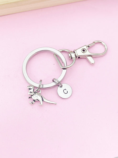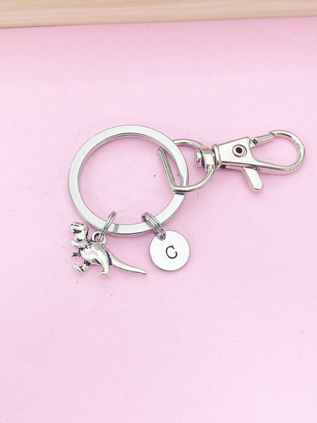 This is a silver-tone dinosaur charm with hand stamped initial charm on keyring.