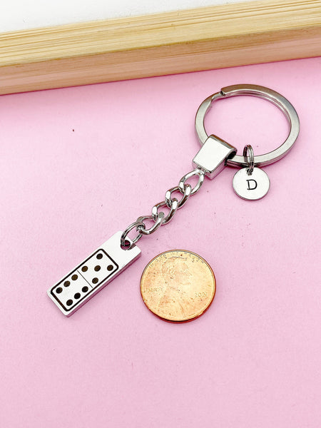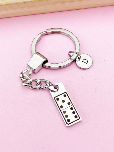 This is an engraving Dominoes on stainless-steel with hand stamped initial charm on keyring.