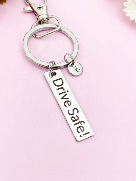 This is an engraving Drive Safe on stainless steel tag charm with hand stamp initial charm on keychain or stainless steel 18 inches necklace chain