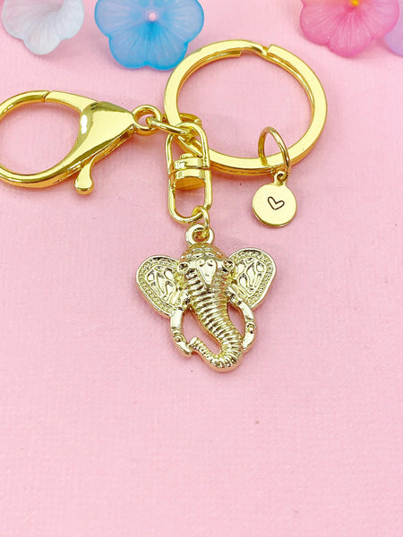 This is a gold -tone elephant charm with hand stamped initial charm on brass /stainless steel 18 inches chain or keyring.