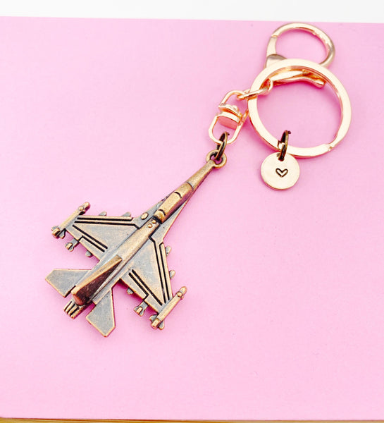 This is a red copper -tone fighter jet charm with hand stamped initial charm on keyring.