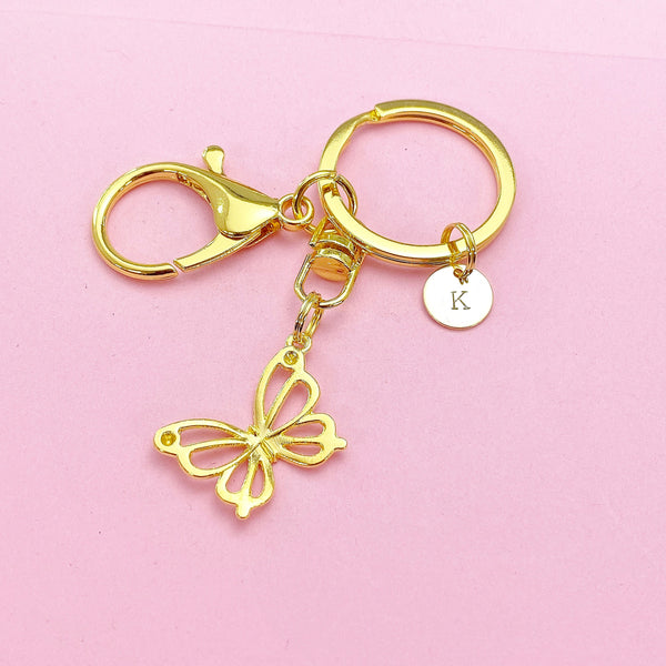 This is a gold, rose gold or silver-tone butterfly charm with hand stamped initial charm on keyring.