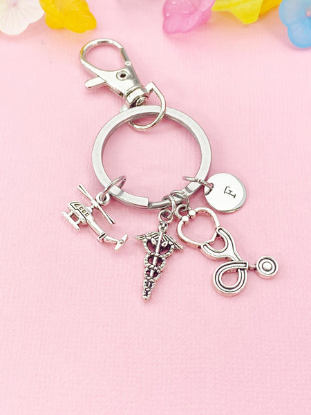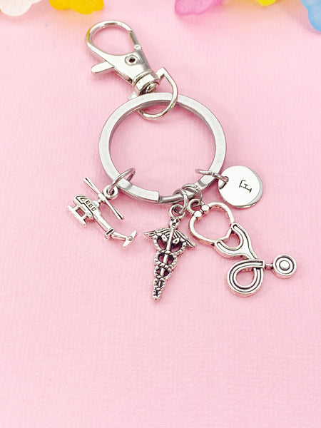 This is a silver -tone Caduceus Stethoscope Helicopter charm with hand stamped initial charm on brass/stainless steel 18 inches chain or keyring.