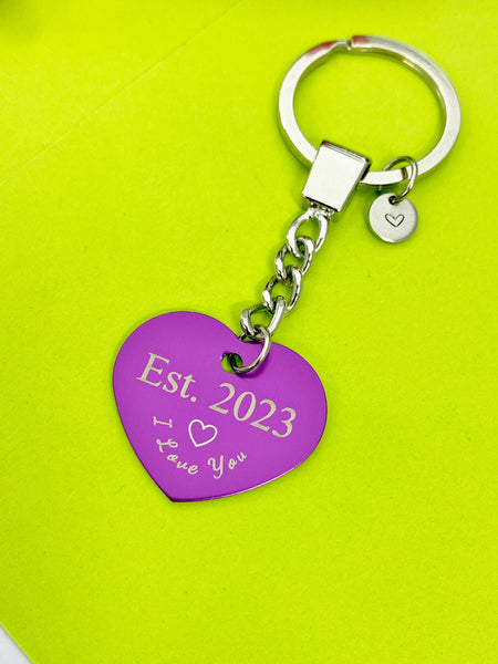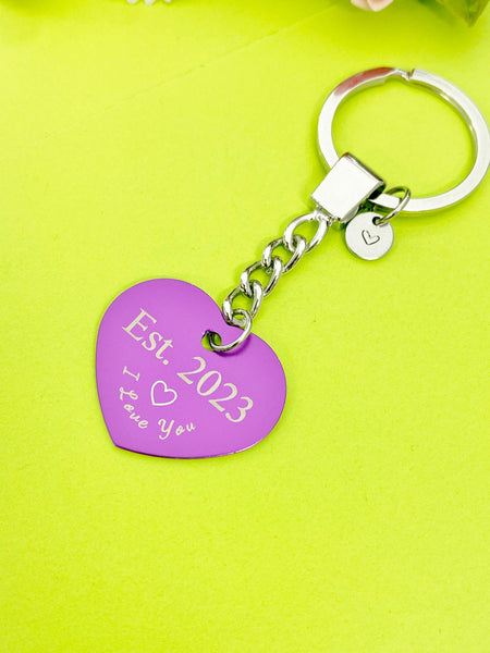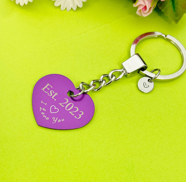 This is an engraving I love you and years on aluminum heart with hand stamp initial charm on keychain.