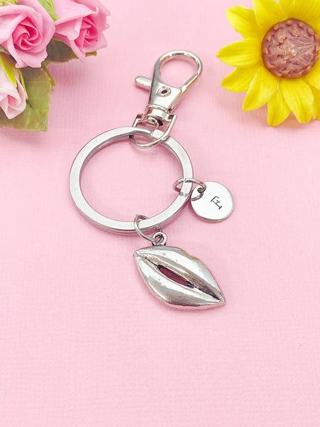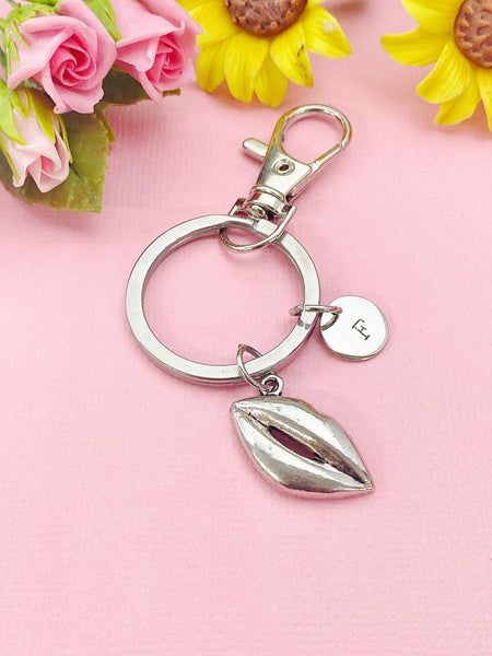 This is silver tone lips charm with hand stamped initial charm on brass/stainless steel 18 inches chain or keyring.