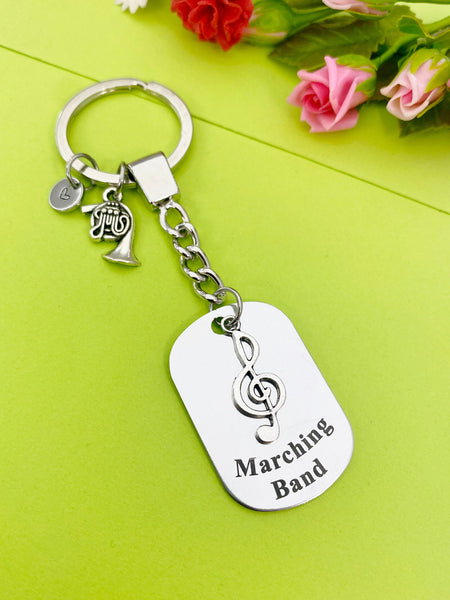 This is an engraving marching band on aluminum tag with french horn, music note and hand stamp initial charm on key ring.