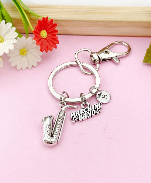 This is silver tone saxophone and marching band charm with hand stamped initial charm on keyring.