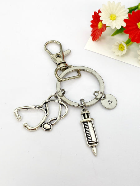 This is a silver-tone stethoscope medical syringe charms with hand stamp initial on keyring.