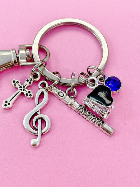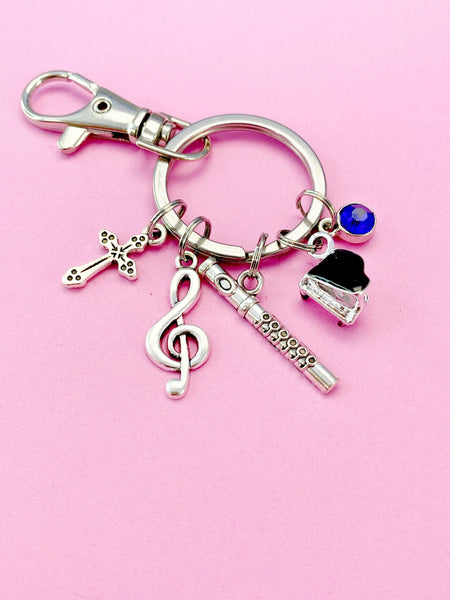 This is a silver-tone Grand Piano, Flute and a Treble Clef charm with birthstone charm on keyring.