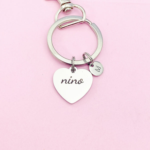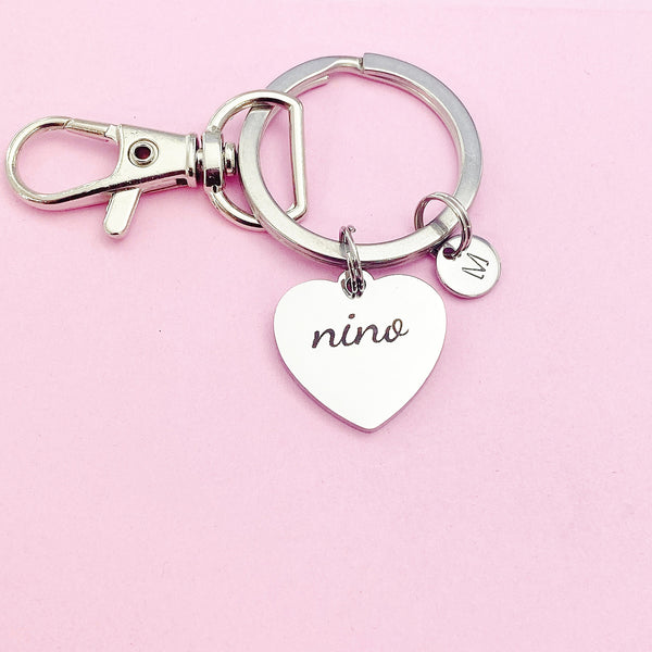 This is engraving Nino on stainless-steel heart charm with hand stamped initial charm on keyring.