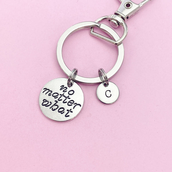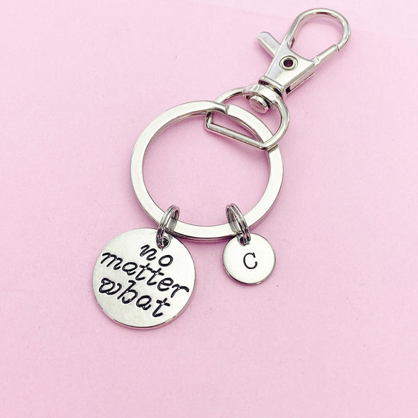 This is a silver-tone No Matter What charms with hand stamped initial charm on keyring.