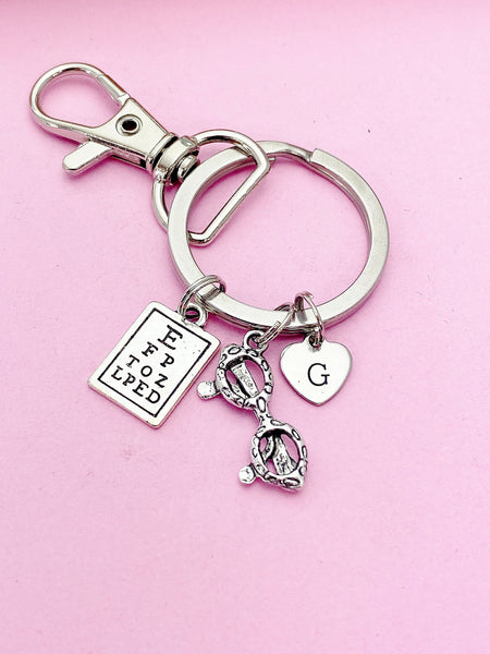 This is a silver-tone Eye Chart Glasses charm with hand stamped initial charm on keyring.