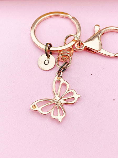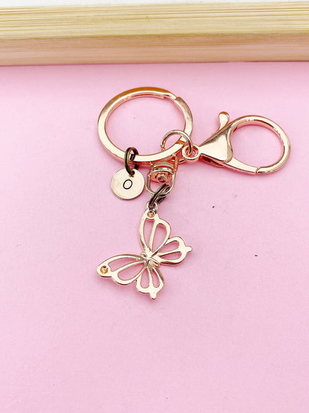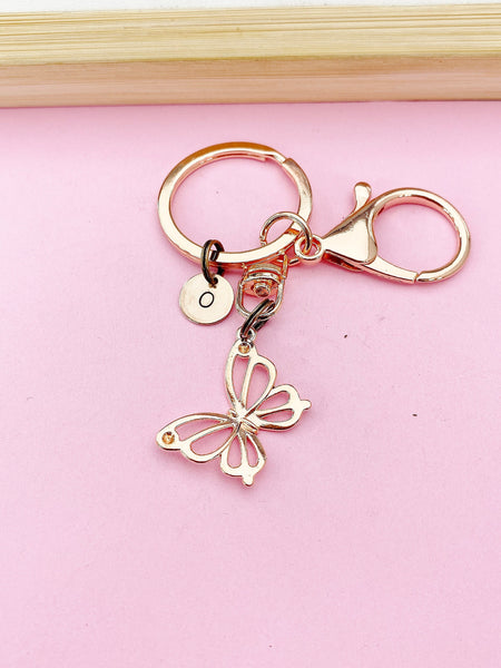 This is a rose gold-tone butterfly charm with hand stamped initial charm on keyring.