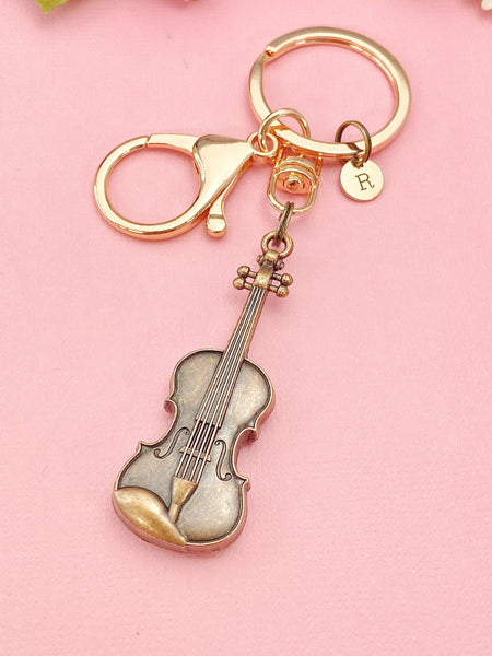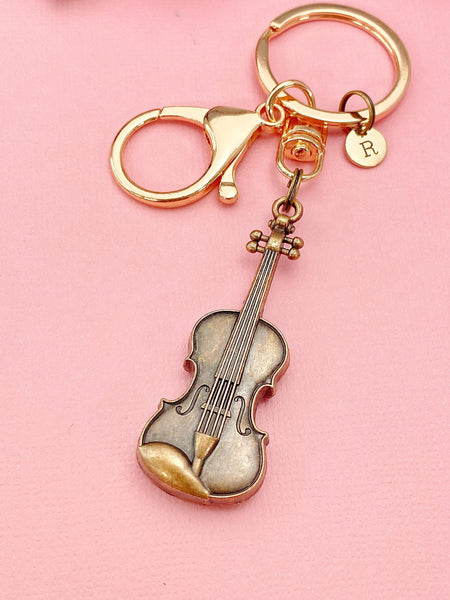 This is a red copper/rosed gold or gold-tone violin charm with hand stamped initial charm on keyring.