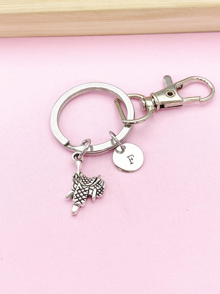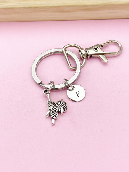 This is a silver-tone saddle charm with hand stamped initial charm on keyring.