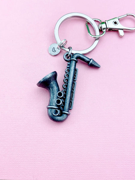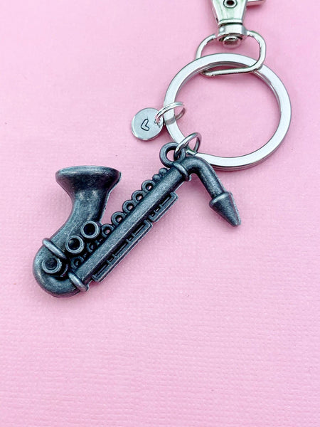 This is an alloy saxophone charm with hand stamped initial charm on brass/stainless steel 18 inches chain or keyring.