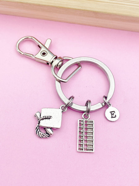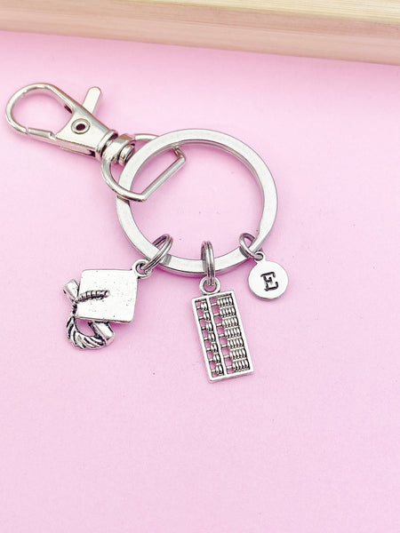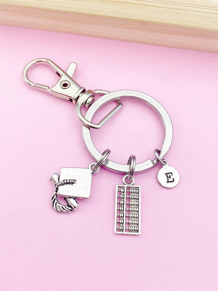 This is a silver-tone alloy abacus and graduation cap charm with hand stamped initial charm on keyring.