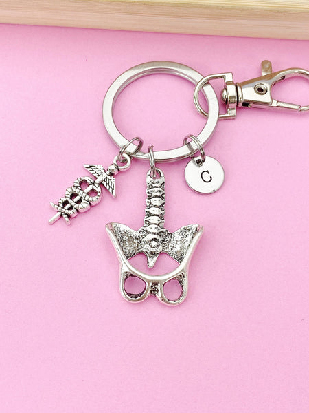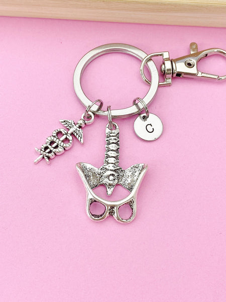 This is a silver-tone Anatomical Human Anatomy Pelvis Caduceus charm with hand stamped initial charm on keyring.