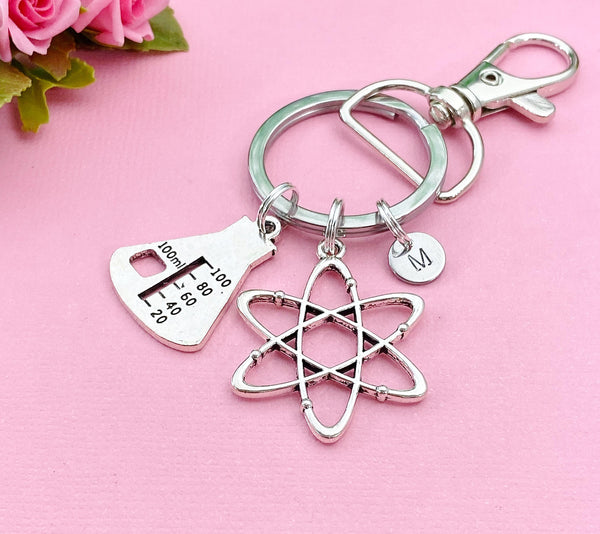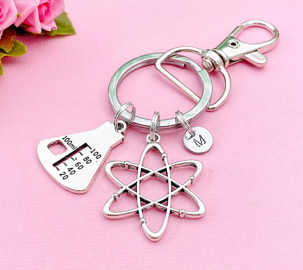 This is a silver-tone atom and beaker charm with hand stamped initial charm on keyring.