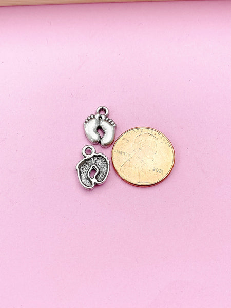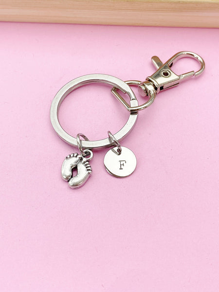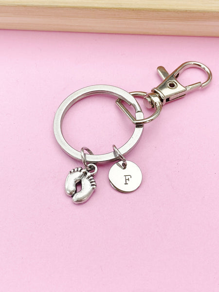 This is a silver-tone Baby Footprint charm with hand stamped initial charm on keyring.