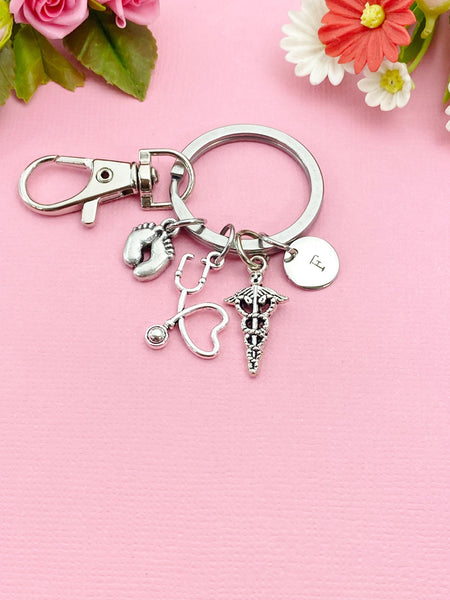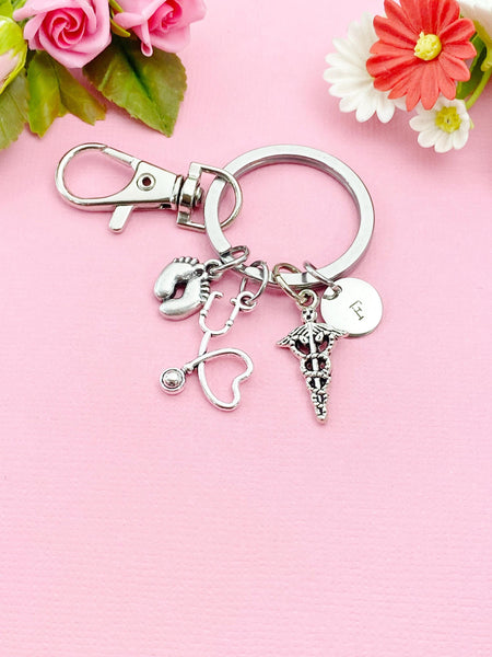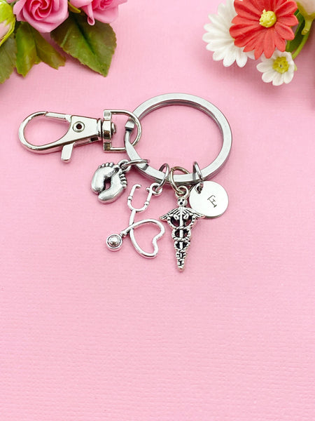 This is a silver-tone Baby Footprint Stethoscope Caduceus charm with hand stamped initial charm on keyring.