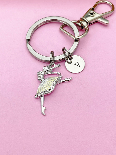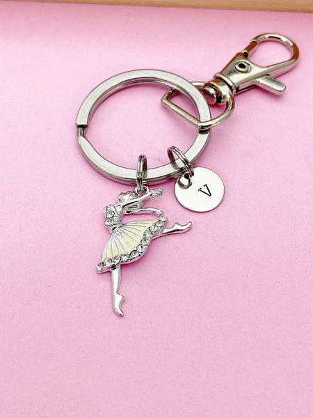 This is a silver-tone ballet charm with hand stamped initial charm on keyring.