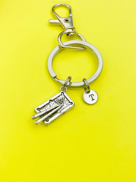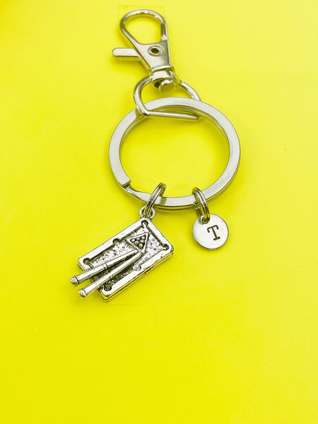 This is a silver-tone pool table charm with hand stamped initial charm on keyring.