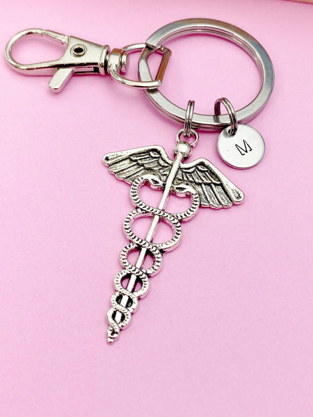 This is a silver-tone Caduceus charm with hand stamped initial charm on keyring.