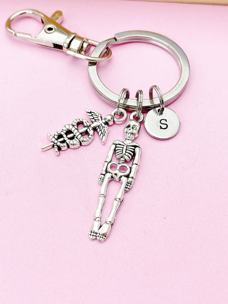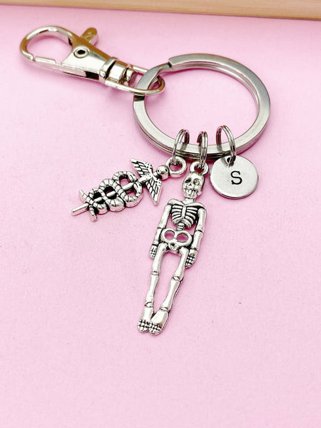 This is a silver-tone caduceus and skeleton charms with hand stamp initial on keyring.