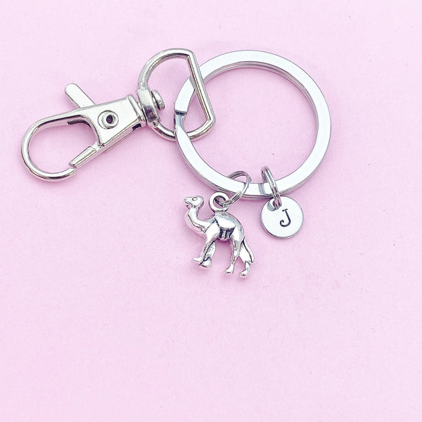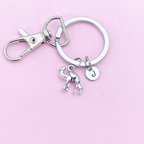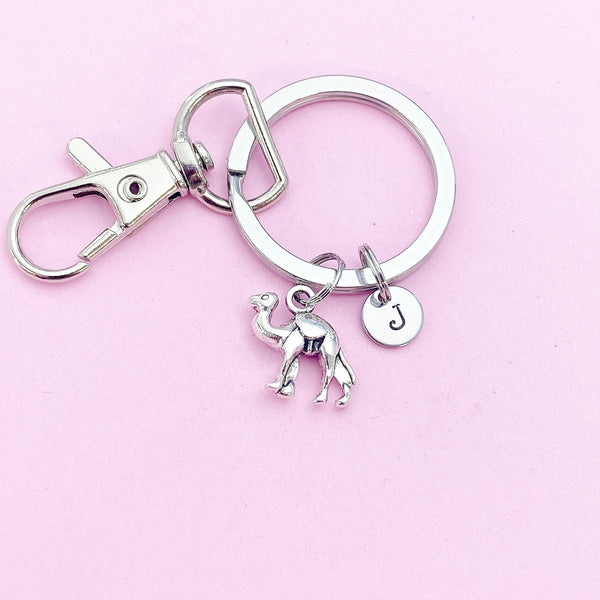 This is a silver-tone camel charm with hand stamped initial charm on keyring.