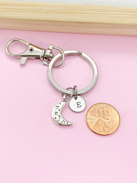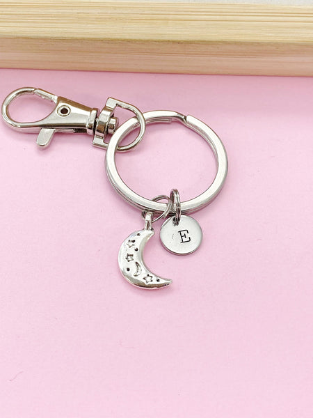 This is a silver-tone moon charm with hand stamped initial charm on keyring.