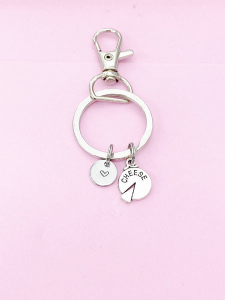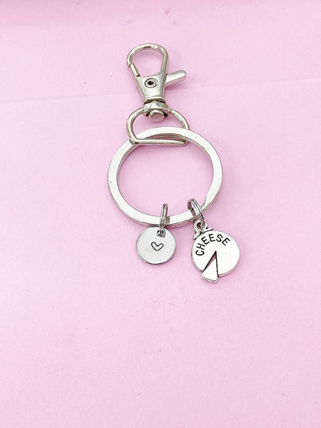 This is a silver-tone cheese charm with hand stamped initial charm on keyring.