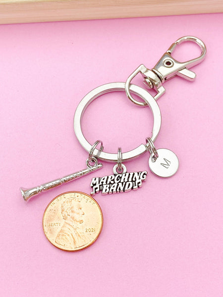 This is a silver-tone Clarinet Marching Band charm with hand stamped initial charm on keyring.