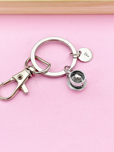 This is a silver-tone coffee cup charm with hand stamped initial charm on keyring.