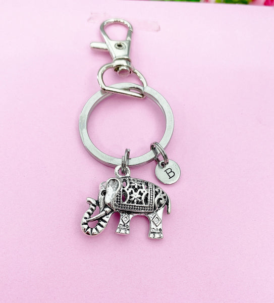 This is a silver-tone elephant charm with hand stamped initial charm on keyring.