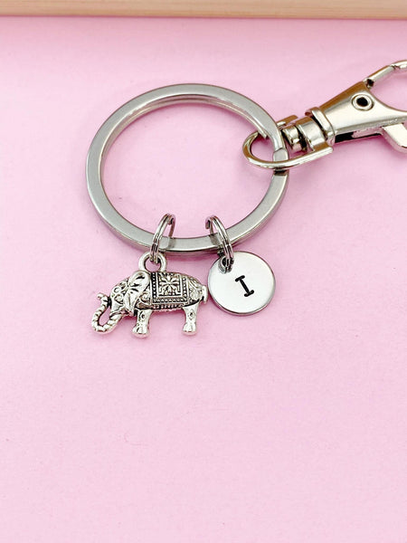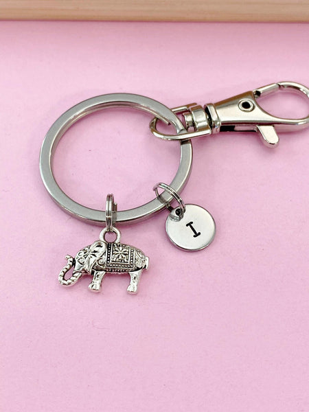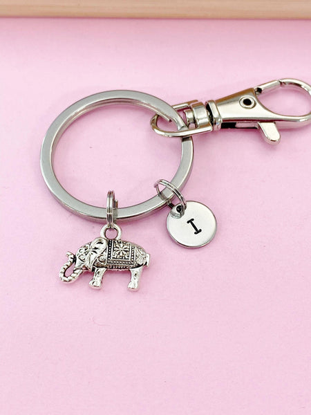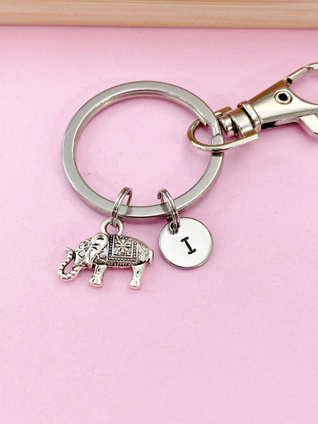 This is a silver-tone elephant charm with hand stamped initial charm on keyring.