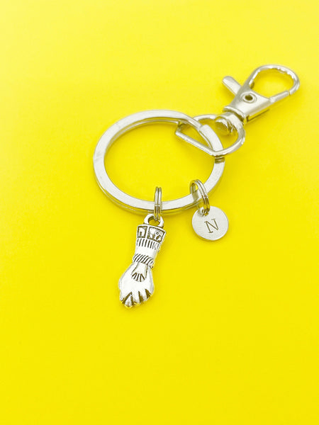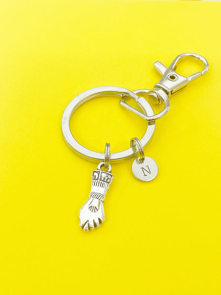 This is silver tone Figa hand charm with hand stamped initial charm on keyring.
