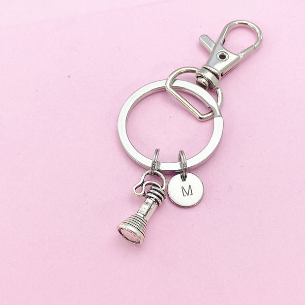 This is a silver-tone alloy flashlight charm with hand stamped initial charm on keyring.