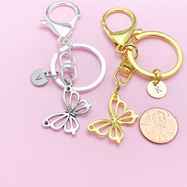 This is a gold, rose gold or silver-tone butterfly charm with hand stamped initial charm on keyring.
