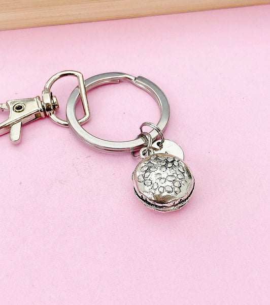 This is a silver-tone burger charm with hand stamped initial charm on keyring.