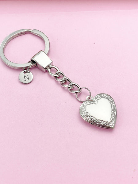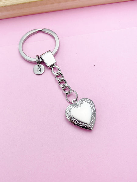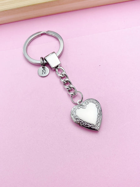 This is a silver-tone Heart Flower Locket with hand stamped initial charm on keychain.
