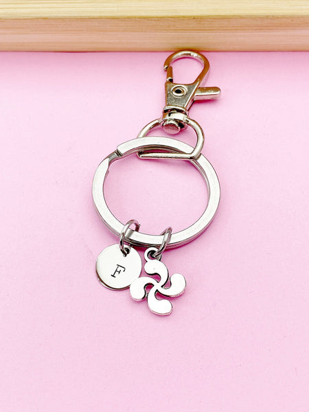 This is a silver-tone Lauburu Cross Basque charm with hand stamped initial charm on keyring.
