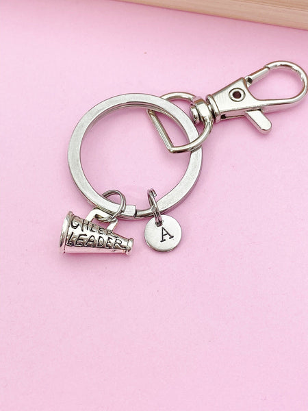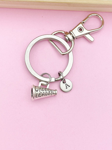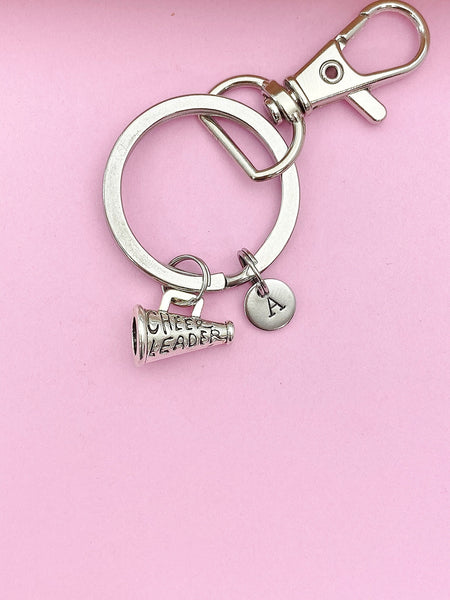 This is a silver-tone megaphone charm with hand stamped initial charm on keyring.
