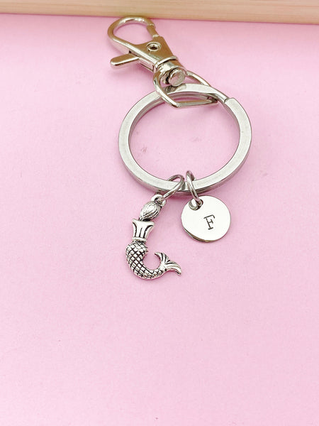 This is a silver-tone mermaid charm with hand stamped initial charm on keyring.