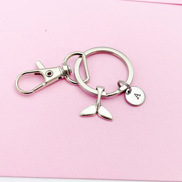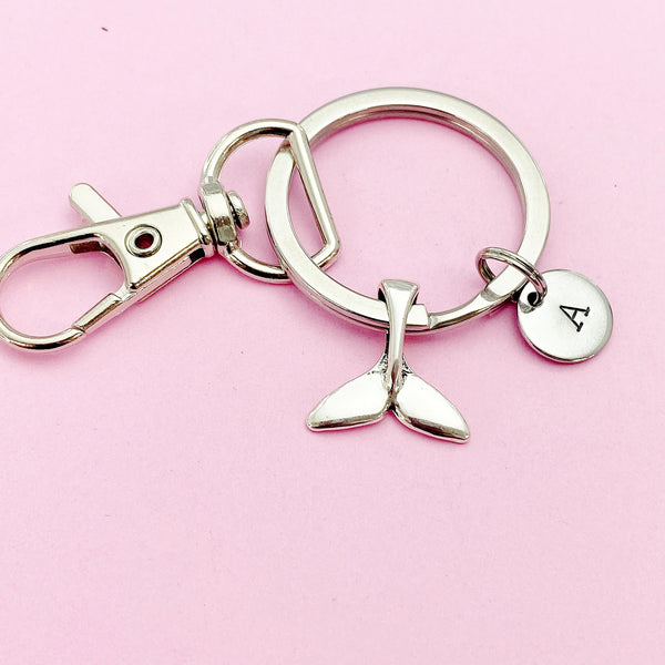 This is a silver-tone mermaid tail charm with hand stamped initial charm on keyring.