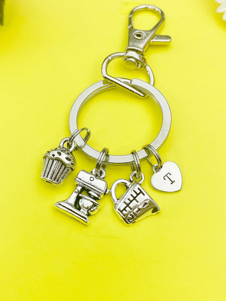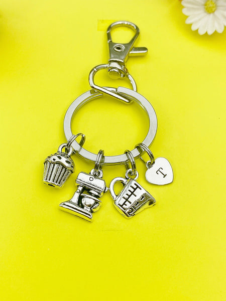 This is a silver-tone kitchen mixer, measuring cup, cupcake charm with hand stamped initial charm on keyring.