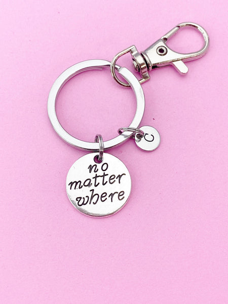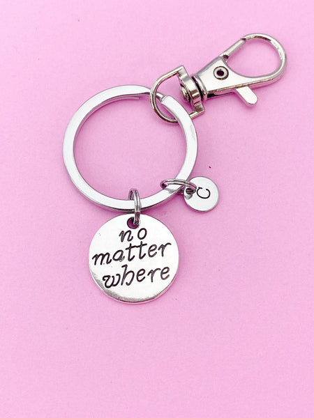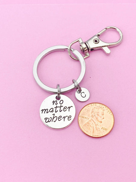 This is a silver-tone No Matter Where Charm with hand stamped initial charm on keyring.